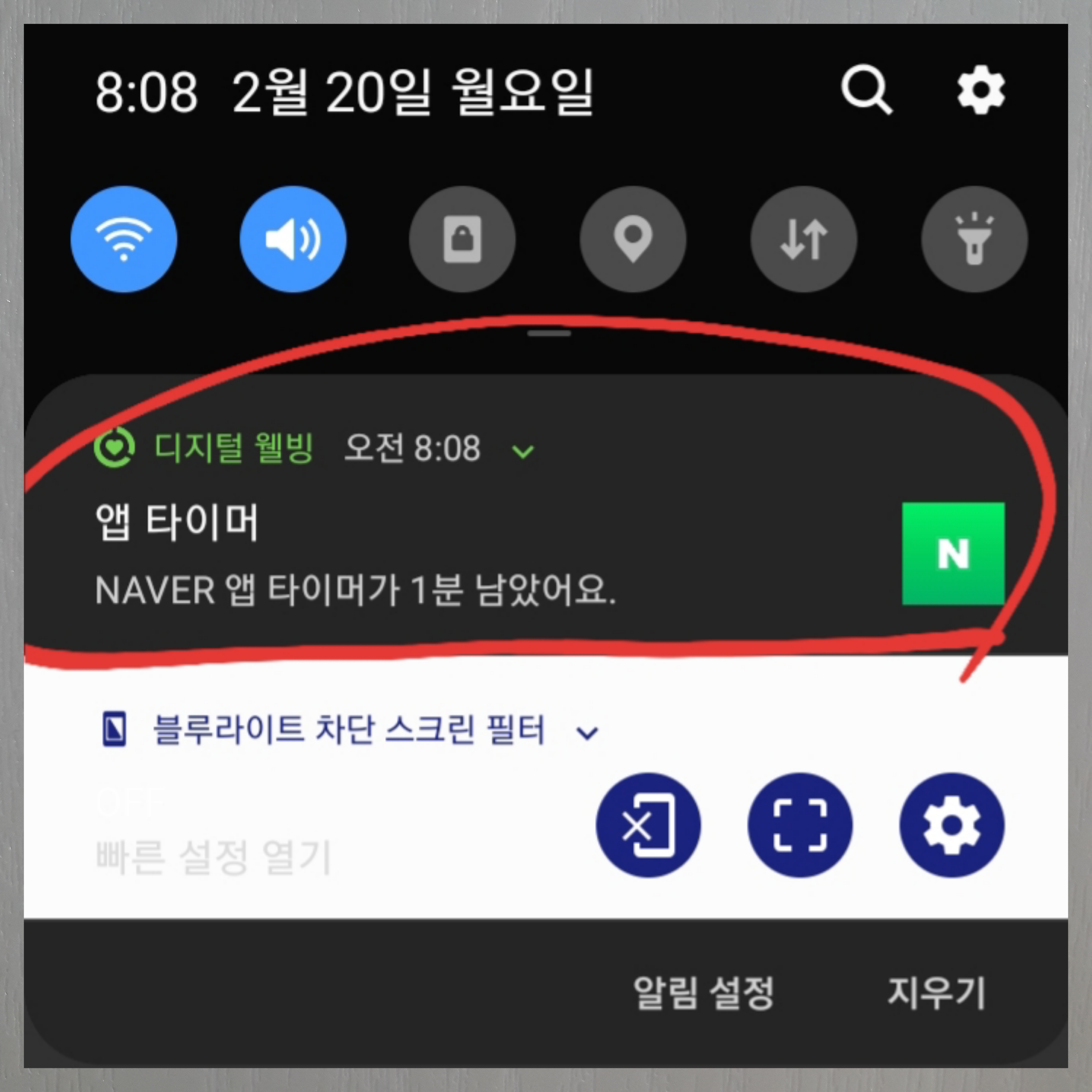 그렇게 얼마나 기다렸을까요. 갑자기 앱 타이머 NAVER 앱 타이머가 1분 남았어요. 라는 알림이 뜨더라고요. 오~ 이거구나! 1분 전부터 알려주는구나~